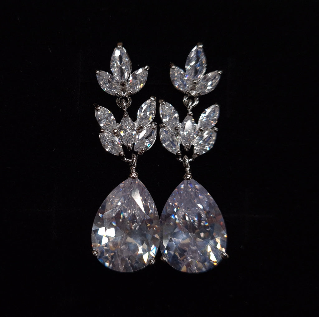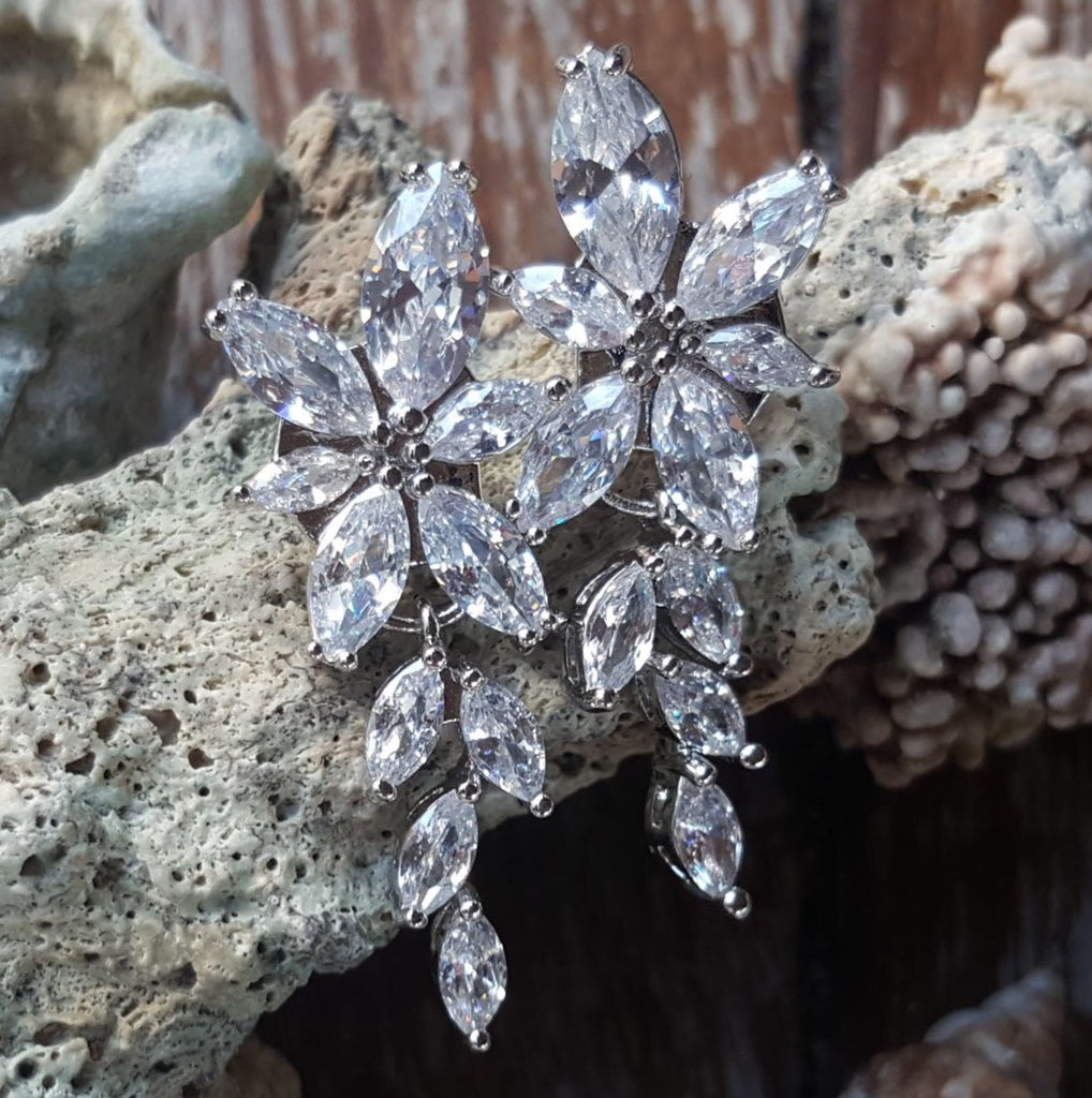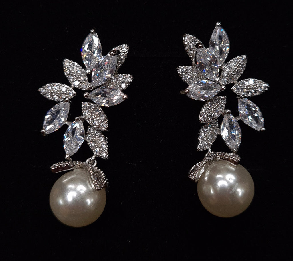 Crystal petals and pearls in silver or rose gold frame with beard drop earrings